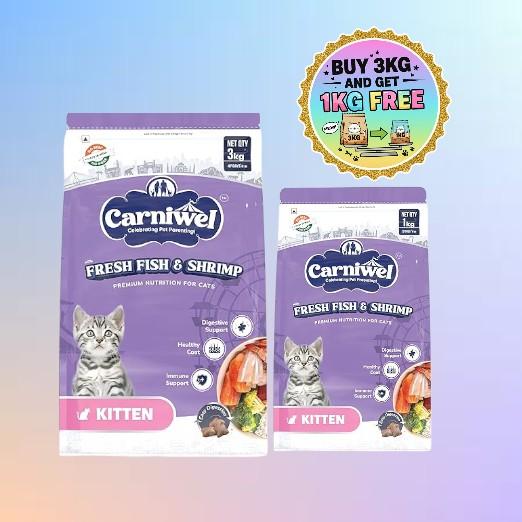 BUY 3KG & GET 1KG FREE Carniwel Cat Food uses Premium ingredients to provide a complete and balanced meal for your cats. Specifically packaged to include all the nutrients your growing kitten needs, Carniwel's dry cat food promises optimal growth, support for strong bones and muscles, a healthy immune system, and brain development - Carnwel's dry cat food is the foundation for your kitten's overall well-being. This Carniwel Kitten Food is formulated with a blend of Omega-3 fatty acids derived from ocean shrimp and marine fish. These essential nutrients promote the development of a healthy, glossy coat, ensuring your kitten looks and feels its best.